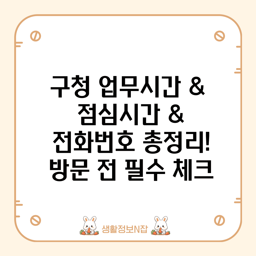 구청을 방문하실 계획이 있으신가요? 방문 전에 업무시간과 점심시간을 정확히 알고 계시면 시간을 절약하고 불필요한 대기를 피할 수 있습니다. 이번 글에서는 구청의 일반적인 업무시간, 점심시간, 그리고 방문 시 유의할 점들을 상세히 알려드리겠습니다.📌 목차구청 업무시간 안내점심시간 및 민원 처리 가능 여부야간 민원실 운영 정보주민센터(동사무소) 업무시간방문 전 필수 체크사항자주 묻는 질문(FAQ)전국 구청 연락처구청 업무시간 대부분의 구청은 평일 오전 9시부터 오후 6시까지 업무를 진행합니다. 그러나 토요일, 일요일, 공휴일에는 휴무이므로 방문 계획 시 참고하시기 바랍니다.점심시간과 민원 처리 구청의 공식 점심시간은 오후 12시부터 1시까지입니다. 하지만 이 시간에도 민원 처리는 가능합니다. 직원들이 교대..